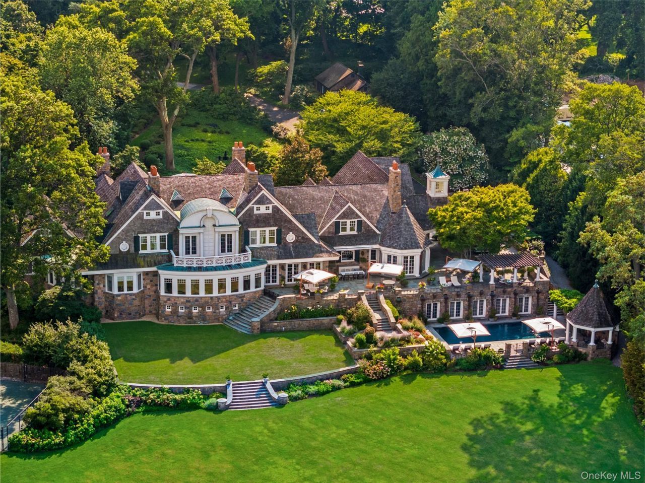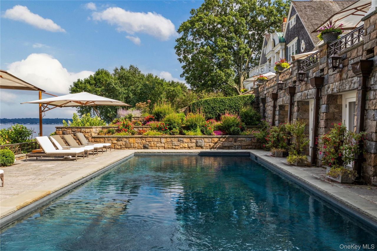Swan Landing is a magnificent waterfront estate custom-designed by Shope Reno Wharton Associates to exemplify luxury at its highest level. Spanning approximately 23,000 square feet and nestled on 5.4 pristine acres on Long Island's North Shore, this stone and shingle masterpiece offers 13 bedrooms and 14 bathrooms in a setting of unparalleled beauty and privacy.A long, tree-lined drive leads past sculpted boxwoods and Tuscan-style columns to the home's striking facade. Inside, grand barrel ceilings and cove lighting guide you into two formal libraries - one clad in English oak, the other in mahogany - each centered around twin 18th-century fireplaces. The heart of the home, a great stair hall with arched windows and custom inlay flooring, leads into a formal living room with panoramic views of Manhasset Bay, curved window walls, circular columns, and refined finishes. The formal dining room features an antique fireplace, crystal chandelier, French doors, and exquisite custom millwork, flowing seamlessly to a stone patio overlooking the waterfront.The chef's kitchen is outfitted with state-of-the-art appliances, a butler's pantry, a two-level island, and custom cabinetry, while the adjacent octagonal breakfast room - with stained glass accents and five sets of French doors - blurs the line between indoor and outdoor living. Throughout the home, bespoke details abound, from padded and cloth walls to Tischler und Sohn windows, blending old-world elegance with modern comfort.The primary suite offers breathtaking water views, 12-foot ceilings, a sitting room, and two lavish ensuite baths, one a hand-tiled mosaic showpiece, the other rich in mahogany and emerald green marble. Two walk-in closets with dressing areas and a custom island add to the suite's refined luxury. Additional amenities on the main level include a refrigerated wine room, antique powder room, a staff suite, and a gated elevator.Upstairs, two distinct guest wings offer seven bedrooms, five bathrooms, office space, a secondary laundry room, and a heated stone terrace. The lower level features an indoor saltwater lap pool with French doors to the outdoors, a gaming area, temperature-controlled wine cellar, and changing rooms.The estate grounds, designed by renowned landscape architect Peter Cummin, are a year-round sanctuary with Japanese maples, beech trees, and hydrangea-draped seawalls. Outdoor highlights include a romantic lily pond, English garden, greenhouse, custom pony house, waterfront Har-Tru tennis court, and a private dock